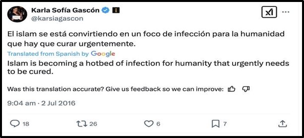 Comme si cette couche raciste et européocentrée du film ne suffisait pas, des propos de l’actrice Karla Sofía Gascón, relevés sur Twitter il y a entre cinq et neuf ans, sont réapparus. Ceux-ci visaient notamment les musulman·es, ou encore George Floyd et le mouvement Black Lives Matter.